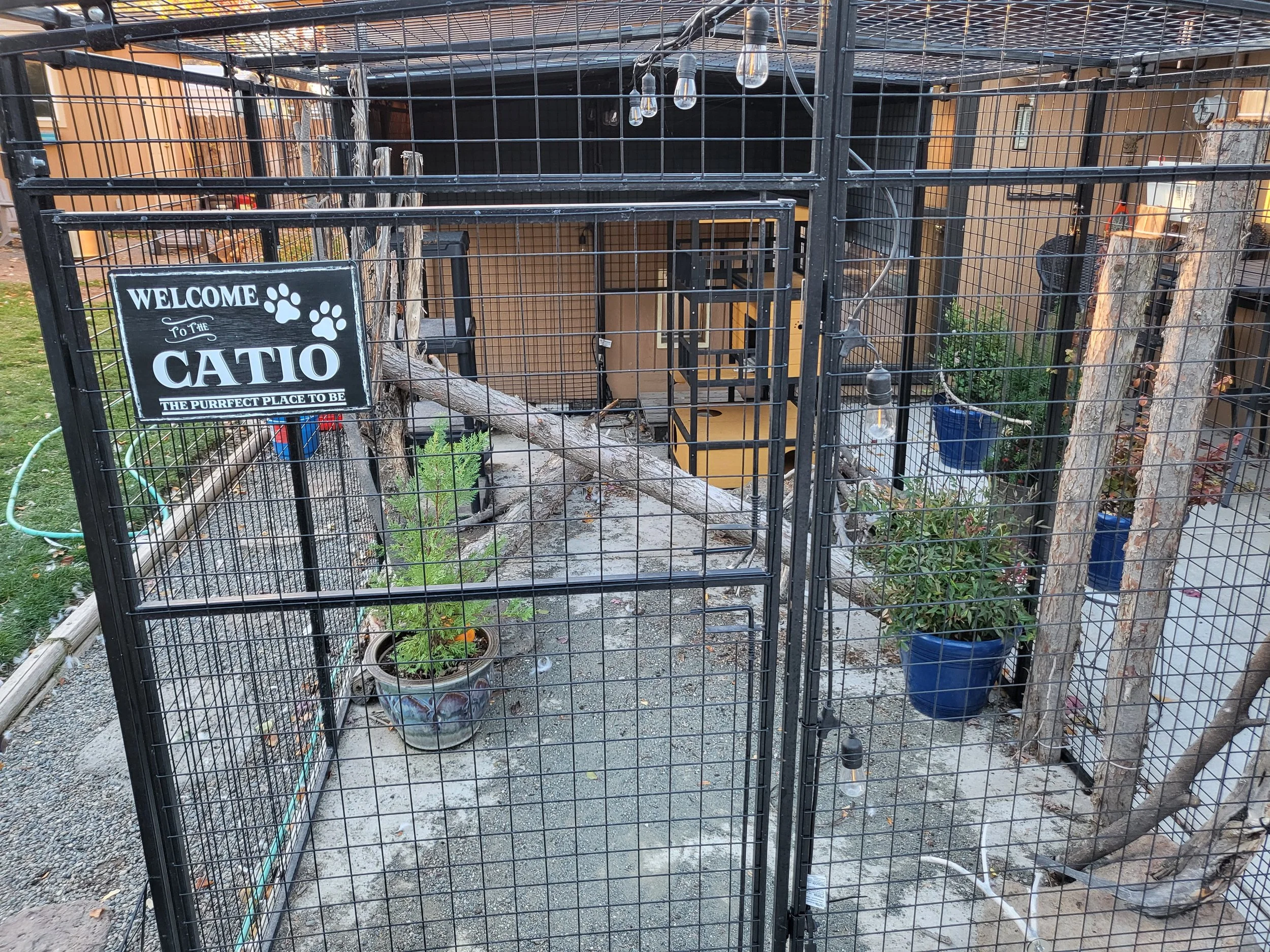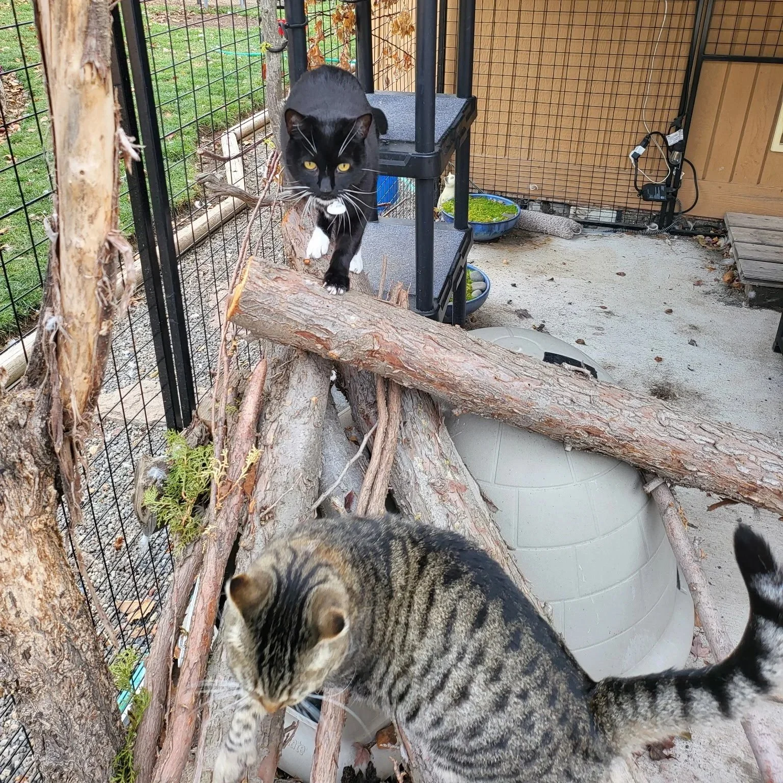 As the directors of The Jade Project, we share our home with five wonderful cats. To give them safe access to the outdoors, we installed a large catio on our concrete back porch. It attaches directly to the house, and our dog–cat door opens right into it. This means the cats can come and go freely throughout the day—sunrise stretching sessions, afternoon birdwatching, and evening lounging included.